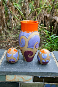 $60 orange/grape/periwinkle small elliptical vase (sold)