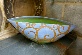 $140 coral/tan paisley elliptical fruit bowl (sold)